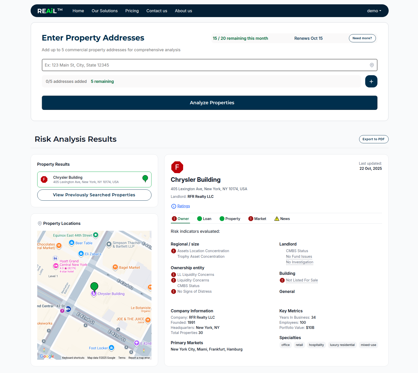 “Is my landlord in trouble?” RiskREport gives you instant access to real-time intelligence on landlords, loans, properties, and markets uncovering hidden red flags like maturing debt, declining DSCR, tax delinquencies, foreclosure signals, and ownership risks. Powered by multi-source, agentic AI-driven analysis, it arms brokers with leverage at the negotiation table and helps tenants avoid risky deals. With RiskREport, you’ll turn your market instincts into data-backed certainty.
